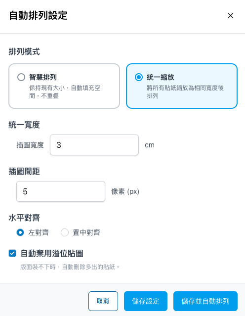 自動排列設定 選擇「智慧排列」或「統一縮放」 設定統一寬度(最低1公分) 設定插圖間距 (插圖跟插圖之間最低距離,預設 5像素,最低1像素) 設定對齊方式: 左對齊 (全部由左至右排列) 置中對齊 (以中心為基準自動排列) 自動棄用溢位貼圖 (當太多插圖進行自動排滿上 有多餘插圖時的策略)