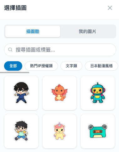 您可使用「插圖酷」來加入圖庫中的插圖,透過類型選單來挑選您喜愛的圖。