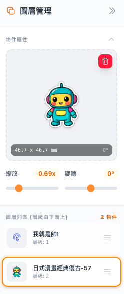 也可以透過畫面右側的圖層管理進行縮放、旋轉、以及 調整上下層。