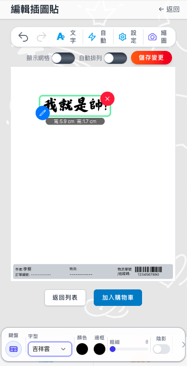 點擊工具列的「文字」按鈕,輸入您的專屬文字,並可自由更換字體、顏色與陰影效果。